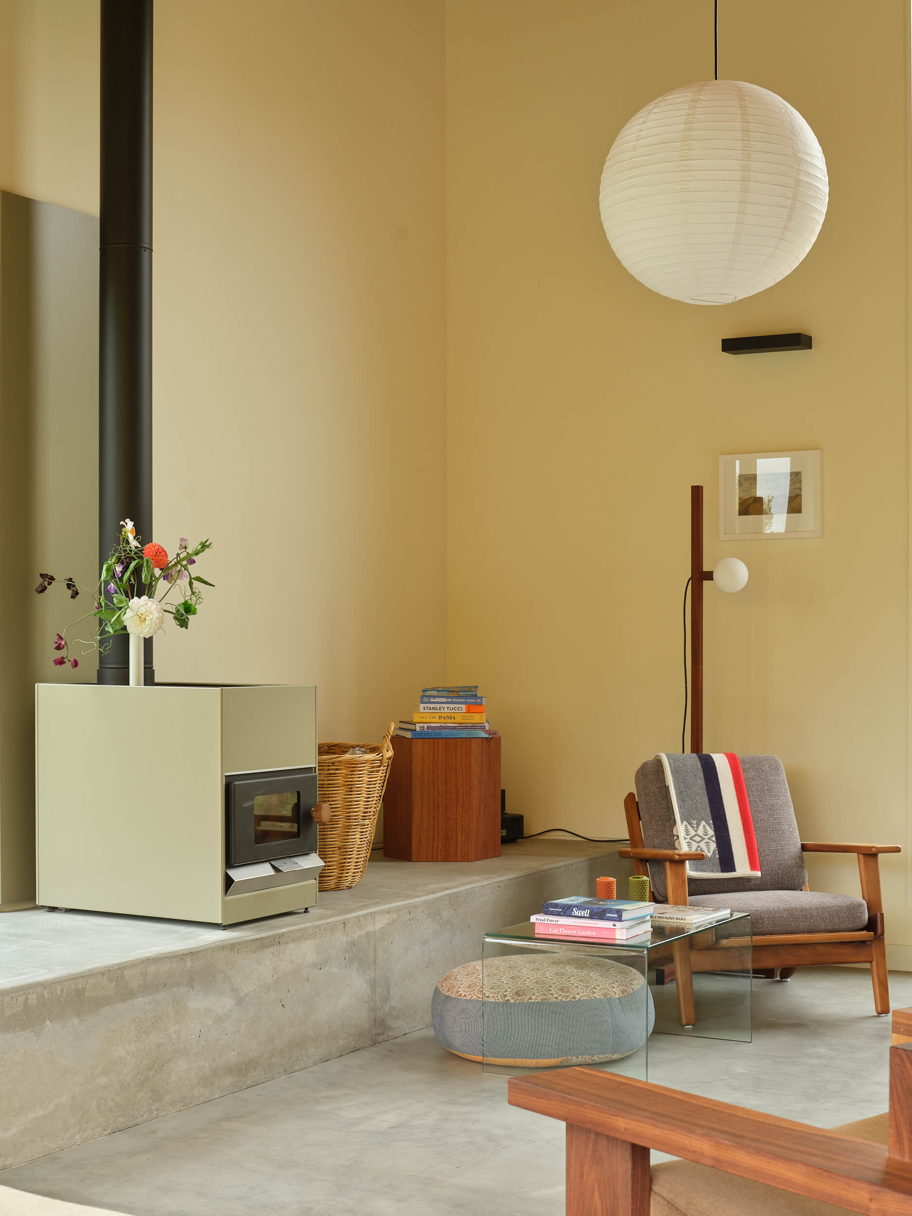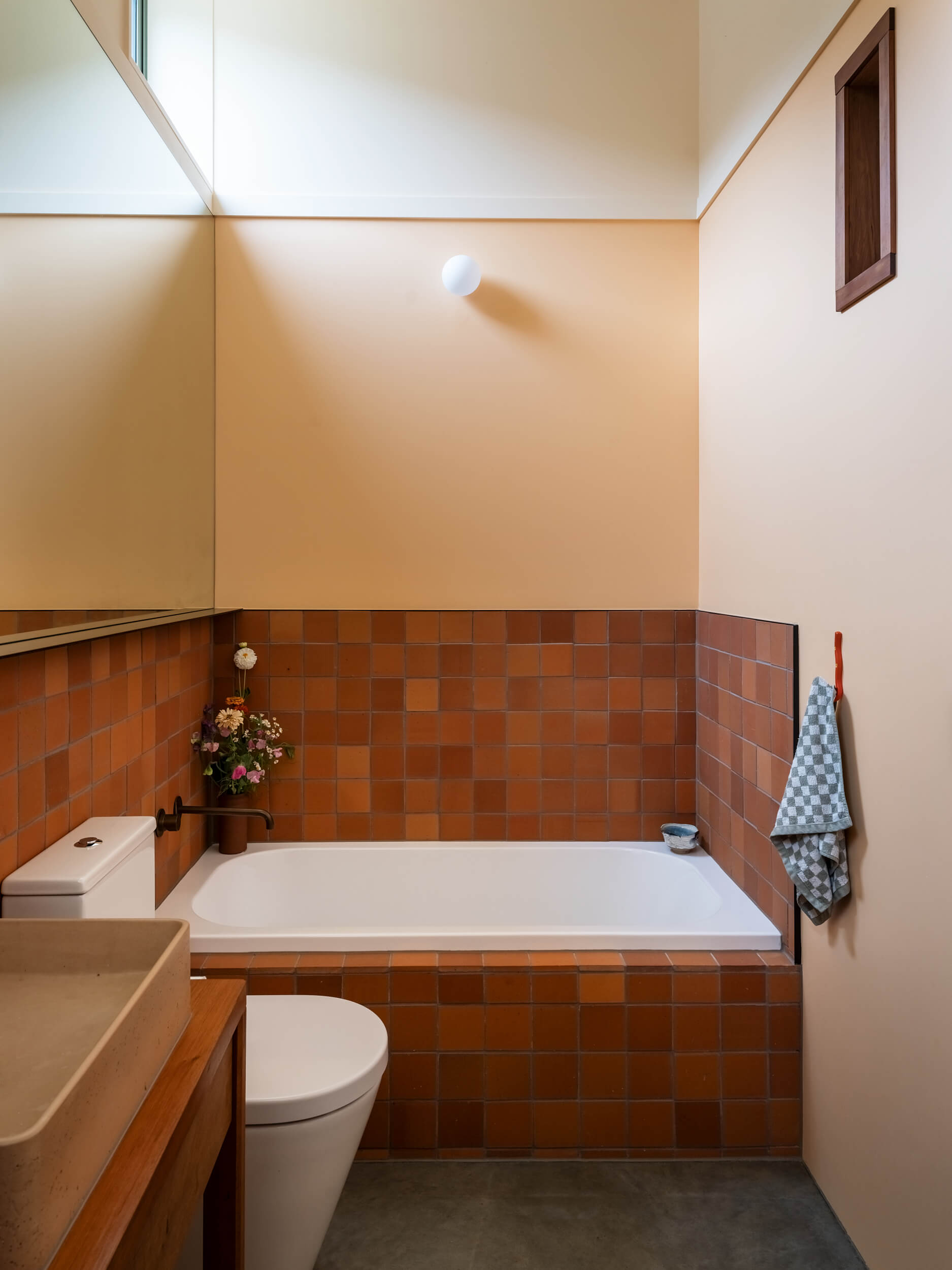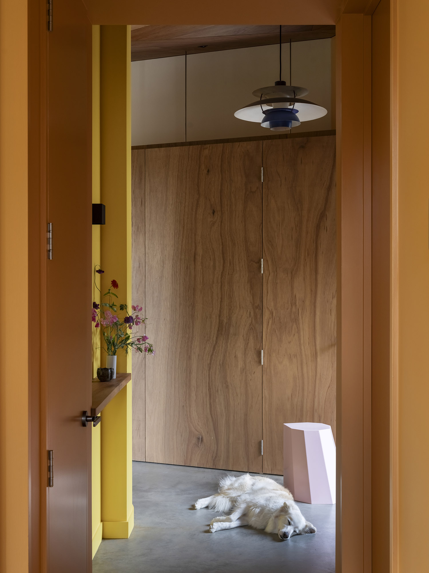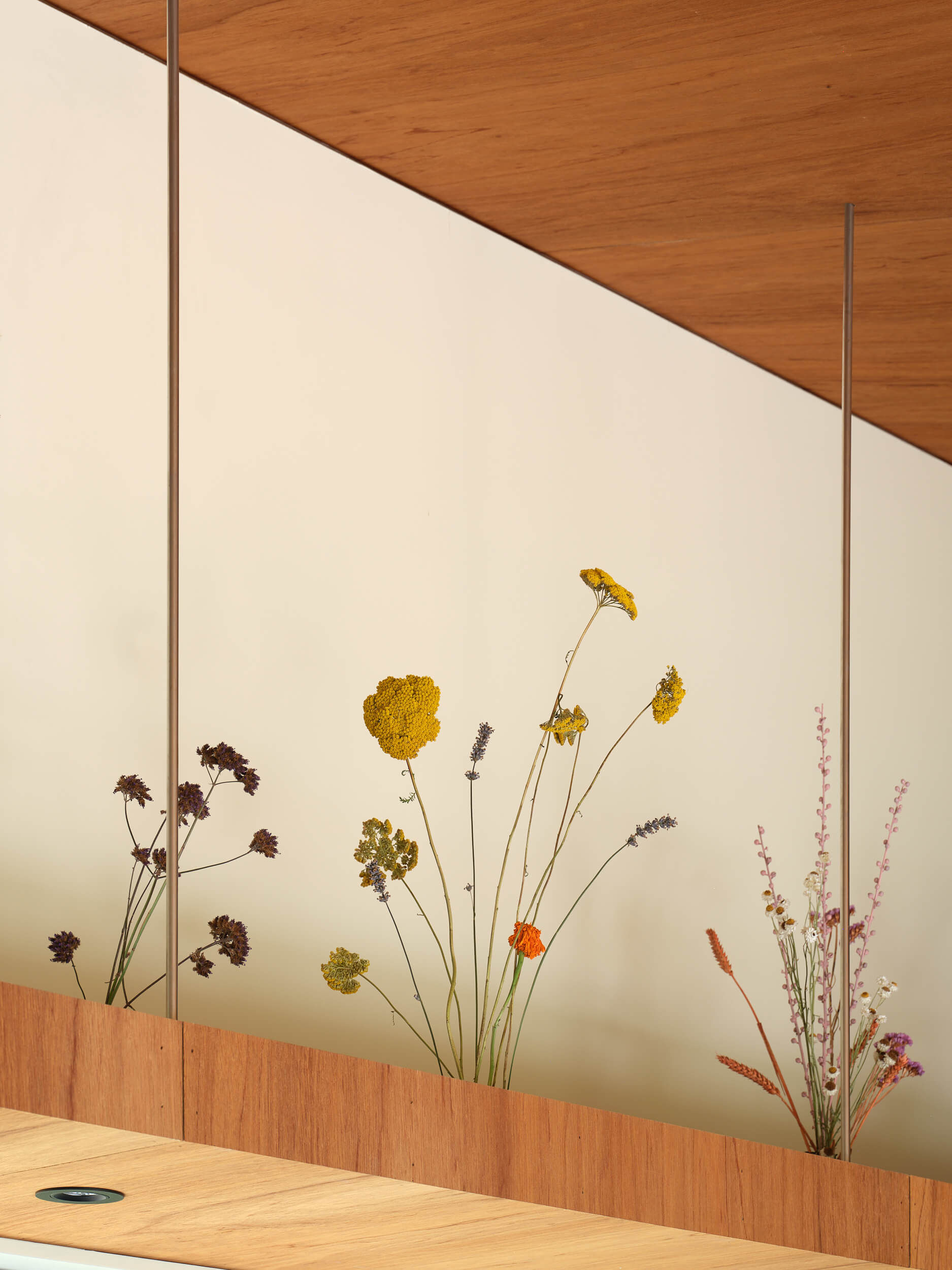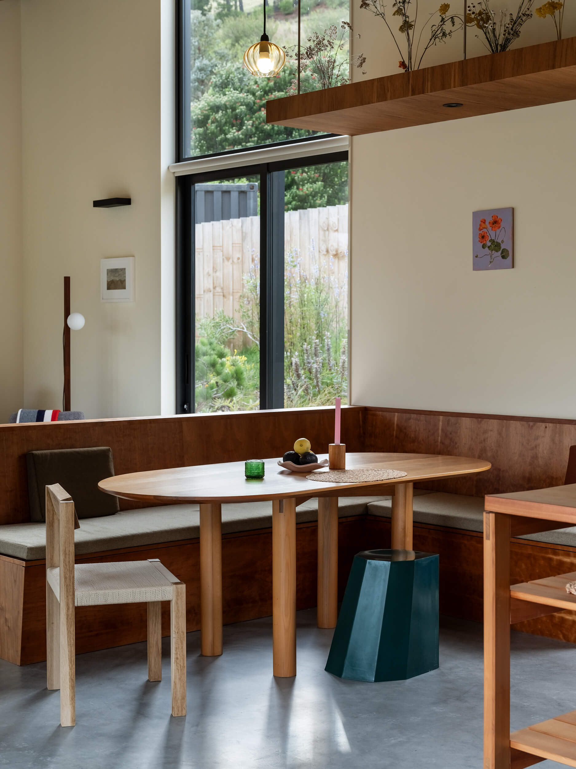 A florist’s sensibility guided the brief—spaces were shaped not just for living but for flowers. Niches, ledges and surfaces in custom-designed cabinetry invite arrangements to take their place within daily life, bringing the garden indoors and marking the changing seasons. The house itself is equally crafted, with a close friend of the owners hand-making the timber kitchen and furniture, infusing the home with both visual warmth and natural textures.